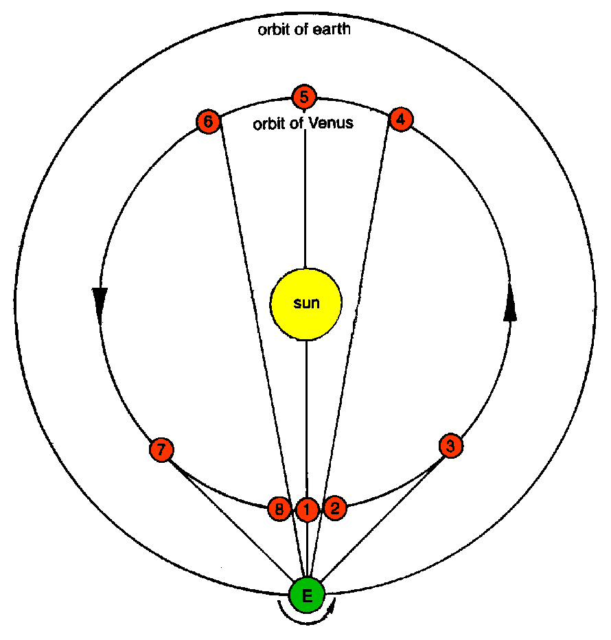 circling the sun with a period of 584 days.[8] When Venus is at position (1), it is invisible, being
