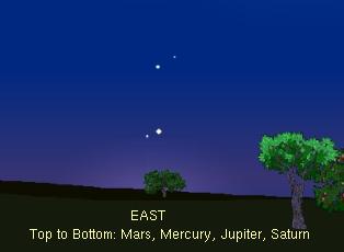 Plotting the position of the planets in the sky on the proposed date of Abraham's birth yields something very much like Jasher describes. Four of the five planets visible to the unaided eye were in a double conjunction which was visible just before dawn. "Conjunction" means that the planets appeared near each other in the sky. It is very unusual to have two conjunctions occur at the same time in the same area of the sky. If there had been a comet there also at that time (which is virtually impossible to verify now), it would have been a remarkable sign indeed. Thus, this double conjunction, coupled with what might be its description in Jasher, adds another witness of this date. The illustration, created with professional astronomy software, shows that the four planets are still visible in the predawn sky near Babylon even after most stars have disappeared.[5]