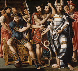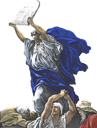 On the first day of the next month they reached the foot of Mr. Sinai (Ex. 19:1). The Lord soon commanded Moses to have all the people prepare for two days so that they could see the cloud descend onto the mount and hear his voice for themselves (Ex. 19:6). They did so and on the morning of the third day, there was thunder and lightning, fire and smoke, and they heard the terrifying voice of a trumpet give a long and loud blast. Then they all heard the voice of God revealing the Ten Commandments, a covenant between Israel and God (Deut. 4:12-13, 5:2-22). The people all accepted with one voice the words of the Lord as a covenant and Moses set up twelve pillars, sacrificed animals, and sprinkled the "blood of the covenant" onto the people so they could never forget the importance of the Ten Commandments (Ex. 24:3-8). Then seventy of the elders of Israel ascended the mount with Moses and Aaron and were allowed to actually see God (Ex. 24:9-12).