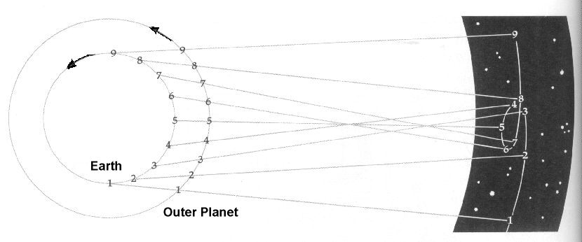 So the birth, prime and death points of the life-cycle of an outer planet are easy to identify. The difference from an inner, evening-morning star planet, is that it does not "resurrect" after dying in the west, by rising as a morning star in the east. Instead, it simply starts another life-cycle at birth. In other words, the inner planets have two distinct parts, an "evening" and a "morning" star phase, whereas the outer planets have only one "all-night" cycle.