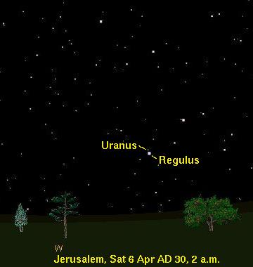 If this is correct thinking then let us consider where the "Meridian of Time" would fall, being after four millennia. It would come in the year AD 28. Did anything happen then? That was very shortly before the Savior's baptism on Sat 6 Oct AD 29 and the beginning of his public ministry on Sat 6 Apr AD 30.[5] The actual conjunctions of Chronos and Regulus can vary from the average date of every 84 years by a year or so. Also, there can be up to three conjunctions because the planet travels in a looped path. Figure 1 shows just how close the conjunction of Chronos and Regulus was on the very day that Christ began his public ministry. Thus, the evidence is mounting that the Lord is indeed using Chronos to measure the great periods of time of the millennia.[6]