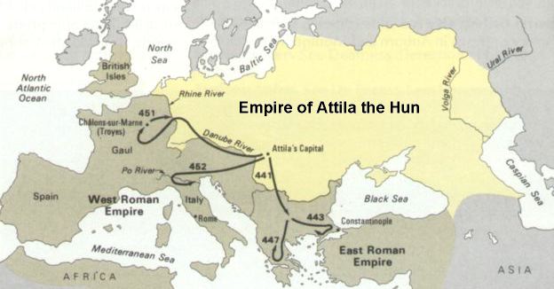 8. The Huns. The Huns were from east of the Caspian sea in Asia, and of uncertain ethnic origin, though sometimes said to be mongoloid. They had been driven west by the Chinese, and they in turn invaded the area east of the Black Sea about AD 372. They drove out many of the Germanic tribes, such as the Alans, into Eastern and then Western Europe. Shortly after the Fall of Rome, from AD 445-453, Attila the Hun created a huge empire north of the Danube that covered most of Europe, all the way over to France (See Figure 3.). Thus, the invasion of the Germanic tribes into the Western Roman Empire was due largely to them having been driven out of their own homelands by the Huns. Looking at Figure 3 might also give insight as to why the Saxons and Anglos might not have been eager to return to their own homeland after having moved to England to help the Britons, for it was being invaded by the Huns. Attila's capital city was in modern-day Hungary, but the Huns were finally driven out later that same century, and I don't know if any nation remains from them. They were replaced in Hungary by the Magyar, who later came from east of the Black Sea, but who are probably not related to the Huns.