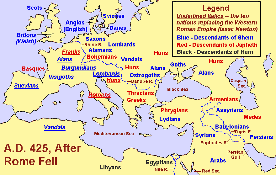 The exact date of the Fall of Rome may be important for understanding this vision, especially because three of the nations were said to have been subsequently uprooted. The nations really seemed to play "musical chairs" during the centuries after Rome fell. That is, they not only did not combine into one big empire, they also did not stay in one place. They each grabbed up what they could of the empire, and then had wars to try to hold onto what they had. So the map in Figure 2 is only a "snapshot" of the empire in AD 425 when nations were still on the move.