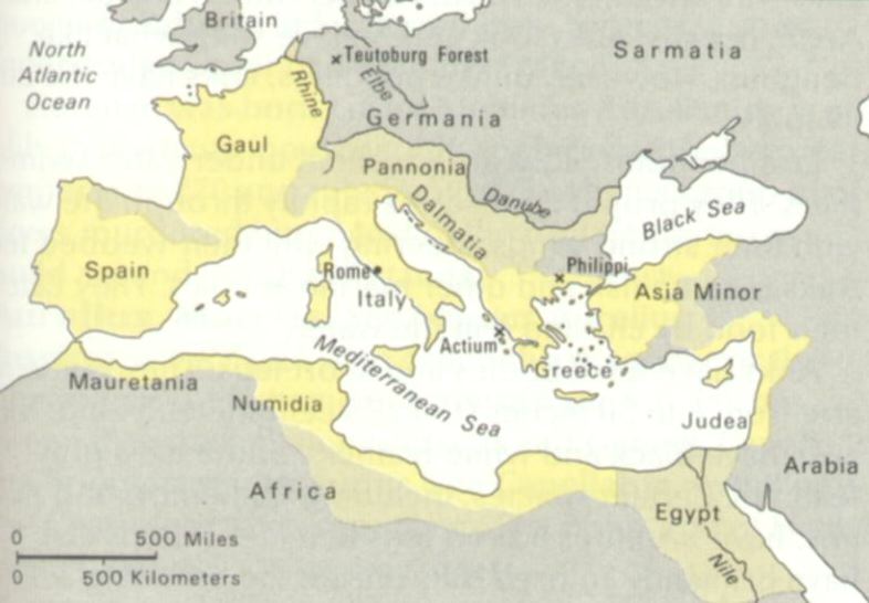 Thus, there seems to be no question in any commentator's mind about the identity of the first four empires. Those kingdoms, and the dates traditionally assigned to them are first Babylon (605 - 538 BC), second Persia (538 - 331 BC), third Greece (331 - 168 BC), and fourth Rome (168 BC - 476 AD). All seem also to agree on the first three principal kings being Nebuchadnezzar of Babylon, Cyrus of Persia, and Alexander of Greece. I'm not aware of anyone, including Newton, identifying the principal king of Rome. My speculation would be that it might well be Augustus Caesar, the first emperor of the Roman Empire. Figure 1 shows how the extent of the empire was enlarged during his reign (the shaded yellow area).