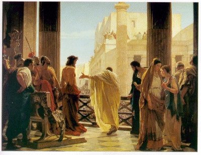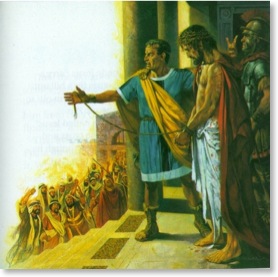 Does anything in that episode sound reminiscent of the scapegoat ritual? Let's see. Both men had been condemned of crimes, hence the goat is an apt symbol for each. They both appeared before a man whose decision held their life in the balance, to die or to be set free. And then one man was sacrificed and one was indeed released. So if this event was prefigured by the ceremony, it could explain a) why Christ was symbolized as a goat, b) the meaning of choosing lots as judging between them,[8] and c) that the scapegoat did not also represent Christ, hence the need for two goats. But then who does the scapegoat really represent? Would it be just some random prisoner?