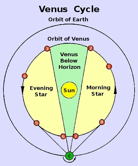 The Venus Calendar keeps track of the position of the planet Venus in the heavens. Venus is nearer to the sun that the earth, so it can never be opposite from the sun in the sky. That means that if you see a bright star up at midnight, it is never Venus. When Venus is near the sun, it is invisible and below the horizon at night. When it is on one side of its orbit from the sun, it is the "morning star" in the eastern dawn sky and when it is on the other side it is the "evening star". It is much brighter than any star in the sky, so it is a really impressive sight. But it can never get very far from the sun.