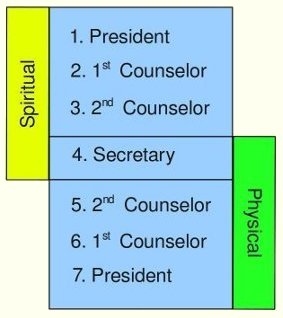 These seven work together as a team, just like the spiritual and physical parts of any living being.[2] The two presidents are not quite equal in authority because there is always one who must preside over all. In this pattern, it is the last who is first. That is, it is #7 which presides over the other 6. This part of the pattern is included in the scriptures. There is a priesthood Quorum of Seventy, and it has seven presidents. It is explicitly stated that the seventh presides over the other six (D&C 107:94). Thus, this pattern appears to be a priesthood pattern.