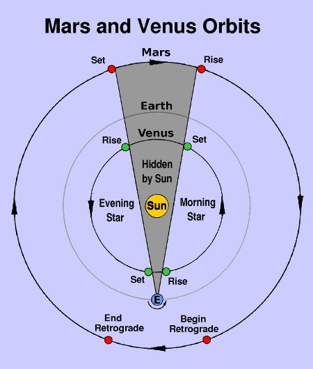The orbit of Venus in Figure 2 is shown as seen from a perspective where both the sun and the earth do not appear to be moving. It shows the orbital points marking its nine phases. The Mars Calendar is expected to have nine similar points, which need to be determined. The orbital period of Venus is about 585 days, as seen from the stationary earth in this illustration. Venus can be seen as either an evening or morning star. It can rise either in the east or the west, and then it stays in that area of the sky until it sets nine months later, never straying far from the sun. It can never be seen at midnight, hence it is called the Evening Star or Morning Star.