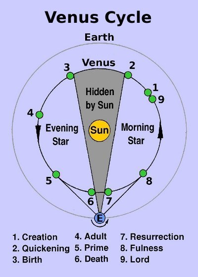In the study of the Venus Calendar, it became clear that the next phase after birth began a period of backsliding from the innocence of youth. It was called "Adult." The Mayan priests said it was the time when evil enters a person's life. The following phase was called "Prime" because it occurred near the brightest point in the cycle of Venus. But further research showed that it corresponds to the time of "rebirth" which ends the backsliding to move forward again. That was not obvious at all with the planets Venus and Mercury, because they do not actually appear to move backwards.