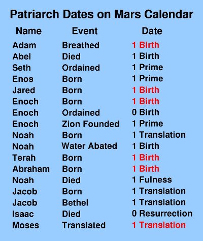 That simple question halted research on this calendar for two decades. Then an answer appeared recently. Mars does not die. It is "translated." "Translated" in this context refers to a change made in the bodies of certain holy people such as the ancient prophet Enoch (Gen. 5:24; D&C 107:48-49). They do not taste of death in the usual manner. It is my understanding that their bodies remain healthy, young, and free from physical pain, possibly for long periods of time. But they are still not immortal and later will also be resurrected to immortality.