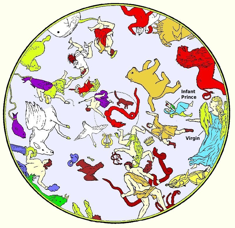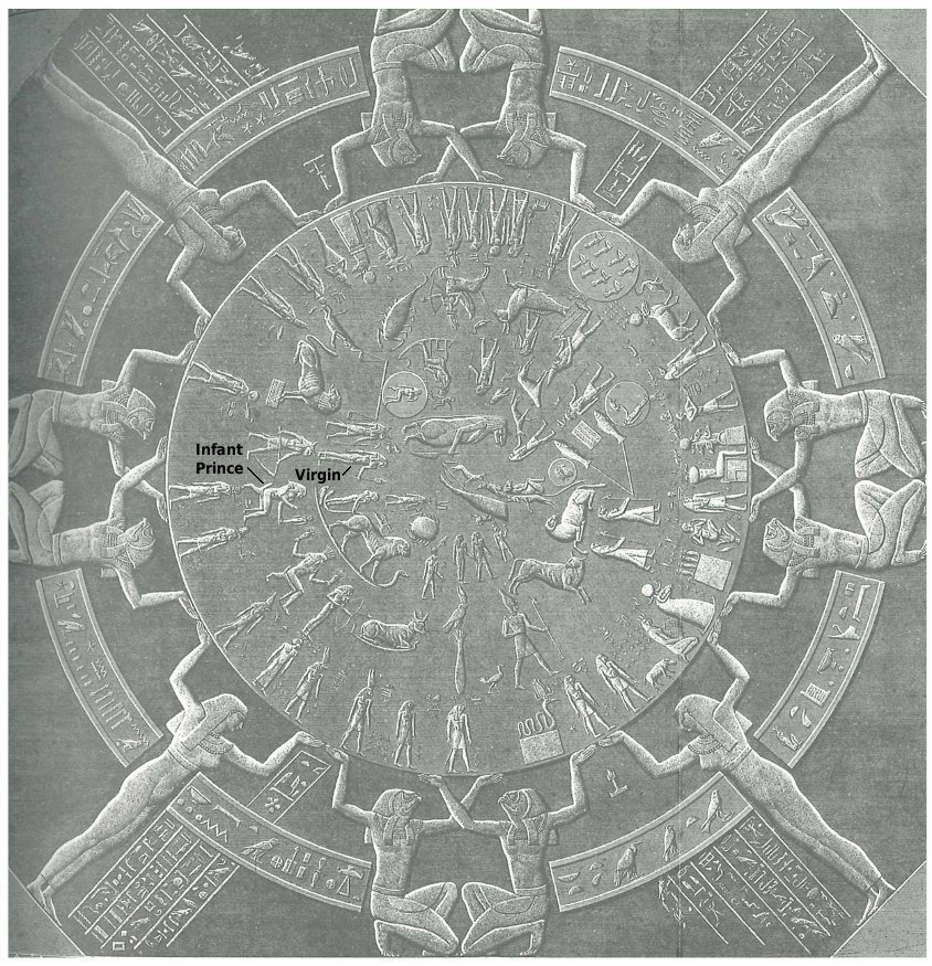A few years ago, this author undertook the project of restoring that lost constellation. It was noticed that the stars in that area exactly fit the shape drawn at Dendera, namely a woman sitting on a chair, holding up an infant-sized man. There is an entire article devoted to restoring that constellation, which was named "The Infant Prince". The figure was drawn to depict Mary holding the infant god Jesus.[2] A comparison of the ancient and modern renditions of this constellation is shown in Fig. 9.