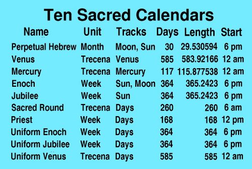 Each of the ten sacred calendars discussed here also has a set of holy days. In the Hebrew Calendar, they are pretty much the usual ones known to Hebrews. In the case of the Venus calendar, they correspond to 9 orbital points, such as when Venus is rising or setting or brightest in the sky.