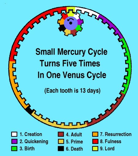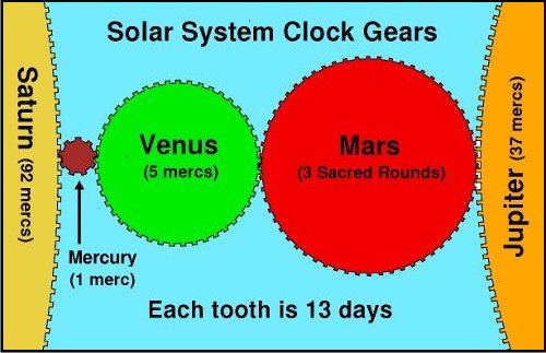 Figure 1 illustrates the use of these two units in the cycles of the visible planets. The period of Mercury is very nearly 1 merc, represented by the little Mercury gear. That wheel is shown with 9 teeth, each of which represents one trecena. The period of Venus is nearly exactly equal to 5 mercs, which is 585 days.[3] The period of Jupiter is 37 mercs and of Saturn is 92 mercs. The period of Mars is exactly 3 Sacred Rounds to the very day (3 x 260 = 780 days).
