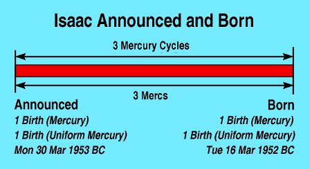 When we look at the date of the angels announcing the birth of Isaac to Sarah and then also look at the day of his birth, we find that the two dates are exactly three mercs apart from each other. The dates are not only the same on both the Mercury and Uniform Mercury calendars, they are all 1 Birth, the one day on both representing birth.