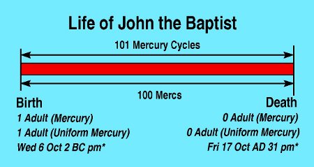 That same period of 12,051 days is an important unit in itself because it is two different realignment intervals. A "realignment interval" is a period of time which is the shortest in which two or more other cycles realign with each other. For example, the merc of 117 days and the true Mercury Cycle of 115.877538 days. If the two cycles begin aligned with each other, then with each succeeding merc, the two cycles will get more and more out of alignment. That is, after one merc, the planet will be about 1.12 days short (117 - 115.88), and after two cycles it will be 2.24 days short, and so on. But no correction is made for about 3.7 years, when an entire trecena is skipped. How long does it take until the two cycles line up again? That will happen when 9 trecenas have been skipped, which takes 33 years. The precise answer is 103 mercs, or 12,051 days! So 103 mercs is a realignment interval for the merc and the Mercury Cycle, meaning that there is no shorter period which realigns the two cycles so well. 12,051 days is also a realignment interval for the Mercury Cycle, the trecena and the year.[4] And that period turns out to be exactly the 33-year period from the Savior's birth to resurrection.