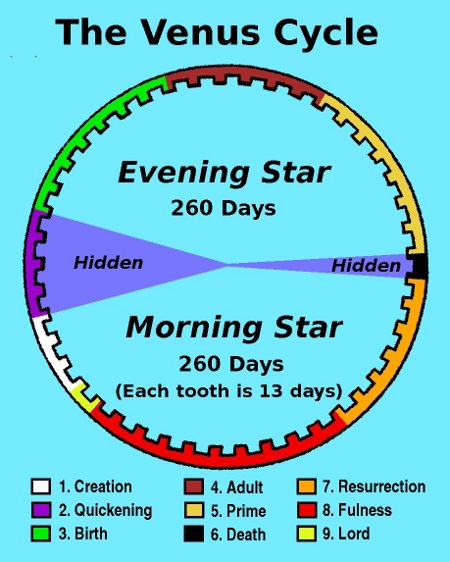 Here it should be noted that the calendars which track the planets only follow the average positions of the planets in the sky. The actual positions can very significantly, but the differences are not important to any of the sacred calendars. The pattern is more important than the actual positions which only differ by a few days. It should also be noted that while Venus rises high above the horizon and is visible for some nine months as evening and again as morning star, Mercury is very near the sun and hence is never visible very high above the horizon at all. Then it is visible only for about three weeks at best. Even though it completes more than three cycles per year, usually only one is tilted high for favorable viewing per year as a morning star and another as an evening star.