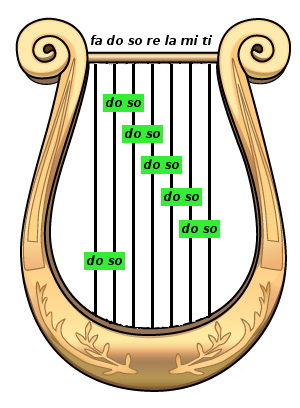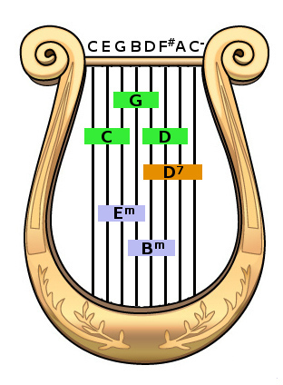 So how can we use this new Wholesome Scale, which can only play songs in the key of G? Instruments like a harp or lyre come to mind, with fixed tuning for each string. That is of course why a lyre has been used in the illustrations. A piano could also be tuned this way, but it could only play in one key. But a guitar would not work because it does not have one string per note. The guitar frets used for different notes are for a chromatic scale only.