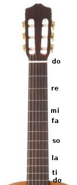 The other choice is to perform the note finding procedure in the opposite direction. That is, look at the original note and consider it to be the so of a lower string. In that case, fa turns out to be a half step above mi and a whole step below so. That turns out to be preferable because of how it sounds and how chords are made, which is covered in the next section. That completes the process of finding the seven notes. In Figure 4, the notes are written above the seven strings.