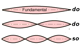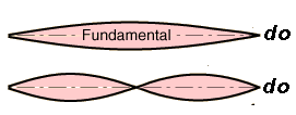 Now consider what happens if the string is plucked about a quarter of the way along, rather than in the center. It will vibrate with at least two frequencies as shown in the lower picture in Figure 1. In addition to the fundamental pattern, the string will also vibrate as if the center of it were holding still. That makes it vibrate at twice the frequency. But no matter where it is plucked, the string will always vibrate mostly at the fundamental frequency. So the effect is that one will hear both the fundamental do note, and also another note of twice the frequency. Because they are usual heard together, and sound so similar, they are given the same name do. The one at twice the frequency is said to be an "octave" higher. It is also called the "first harmonic" of the fundamental frequency.