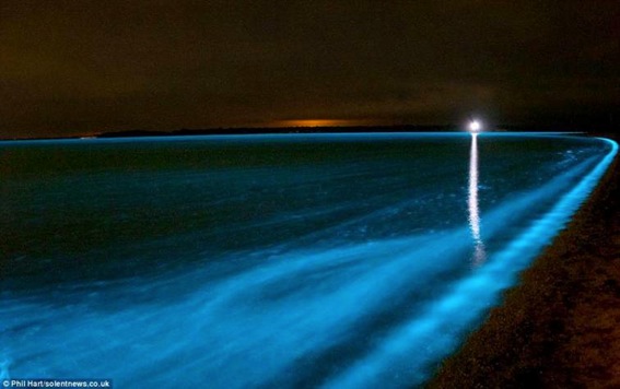 Gipslend Lake, Australia (chemical reaction called bioluminescence turns the water fluorescent blue)