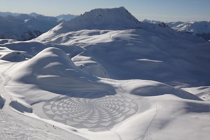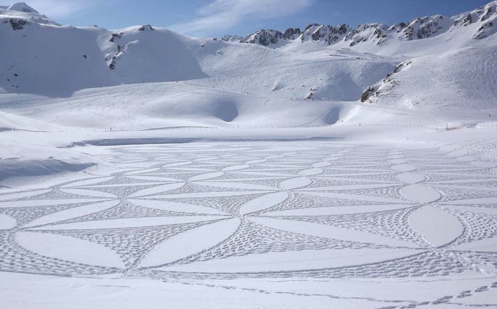 Artist Simon Beck must really love the cold weather! Along the frozen lakes of Savoie, France, he spends days plodding through the snow in raquettes (snowshoes), creating these sensational patterns of snow art. Working for 5-9 hours a day, each final piece is typically the size of three soccer fields! The geometric forms range in mathematical patterns and shapes that create stunning, sometimes 3D, designs when viewed from higher levels.
