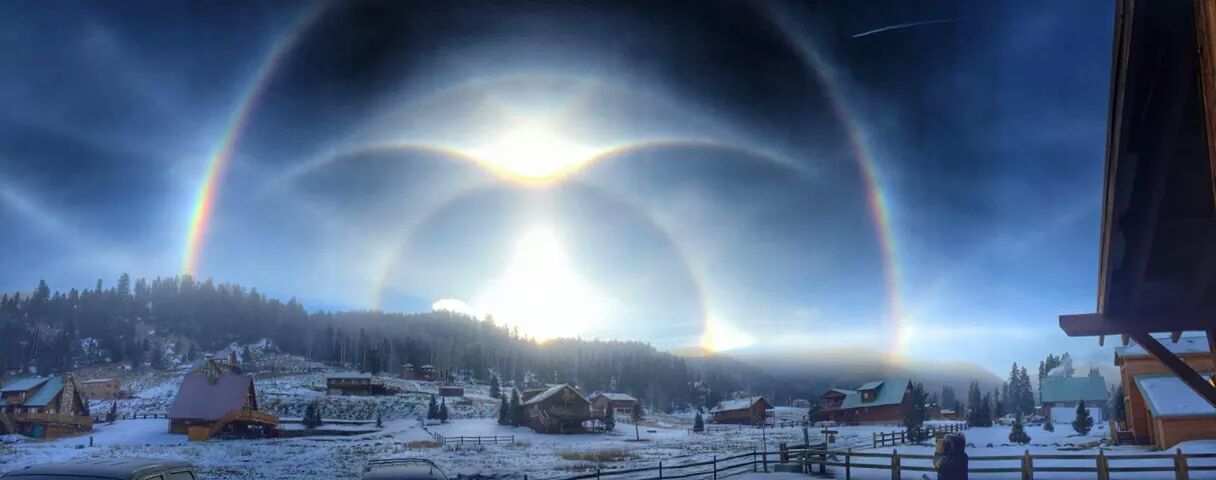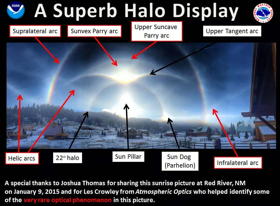 This is the most amazing photo I've ever seen of astounding multiple solar halos. I've read entire books on optical atmospheric phenomena and have never heard of the existence of many of these halos, let alone seeing them all at once! The one labeled "22 degree halo" is the size of the ring around the moon which is commonly seen and is formed by hexagonal ice crystals.--JPP