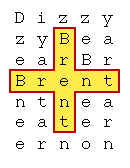 Now count every 5 letters beginning at the first letter to get "DBrentBriggs." That confirms the suspicion of the first initials, but leaves the first name unknown. Starting with the first "D" you can find the name Dan by counting every seventh letter. But to be thorough you should try all possible counts. Counting every 11th letter yields "Dennis." Because that is a much longer name (and hence improbable to be there by chance), and because it begins and ends on the first and last letter, it should be clear that it is the one the puzzle designer had in mind. Note that even the capitalization of the letters comes out correctly. By the way, these codes are the same as used in the very controversial so-called "Bible Codes," except that those codes can run forward or backward.