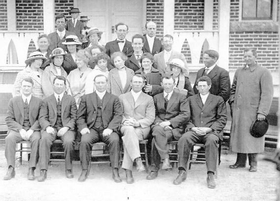 Due to the Mexican Revolution, Achsah and Calvin with boys Calvin & Emerson, had to leave the Colonies and they decided to settle in Oakley Idaho where there was homesteading opportunities there. Calvin Sr. served as Second Councillor in the bishopric. L-R front: George H. Severe, Melvin Walker, Charles Height (blessed Winston and relative to general authority Elder Height), bishop John Elison (first councillor),Wallace Hale, and Calvin D. McOmber Sr. 1st row standing: L-R: Ruby Hale, Genevieve Hunter, Estelle Nelson, Attla Baker, Thurza Hunter, Jennie Hale, Edith Bark, Casper Whittle, Lorenzo Wilson. 2nd row: Louisa Hale, Bertha Severe, Lottie Bach, Locia Hunter, Bertha Seamons, Ascal Eixon, John J. Seamons