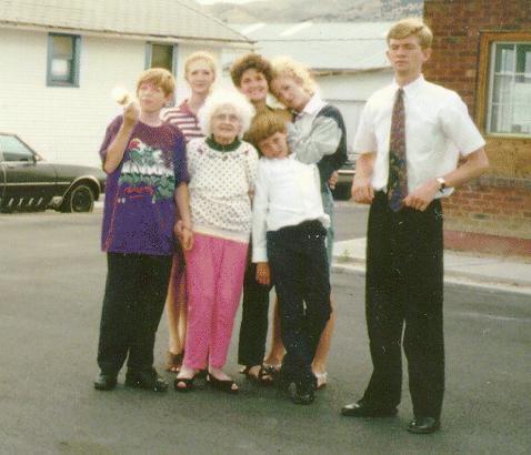 Grandma Frances B. McOmber with Ruth, Mary, Julie, Jared, Joe, and John in front of the homestead homes of 2715 Pole Line Rd. Pocatello, Idaho.