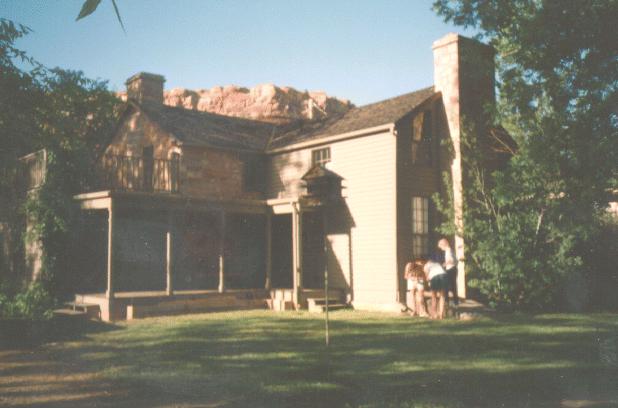 As seen in 1996 from the back. Here is the place where many of the Stout children were born. Achsah was born here. The home is lovely today, having rag rugs made to make the home authentic for its time period. The extra touches of pioneer memorabilia are present. The lovely indoor plumbing and running water and kitchen luxuries are present and coveted by any woman. The Virgin River runs just an acre to the back.
