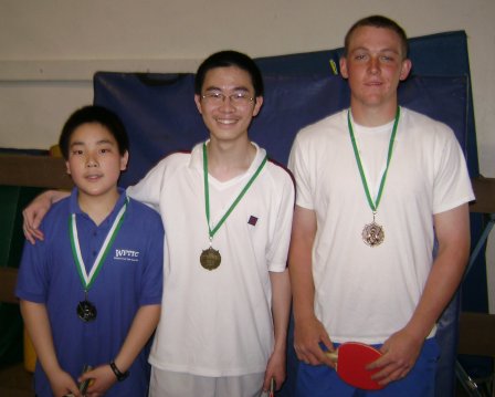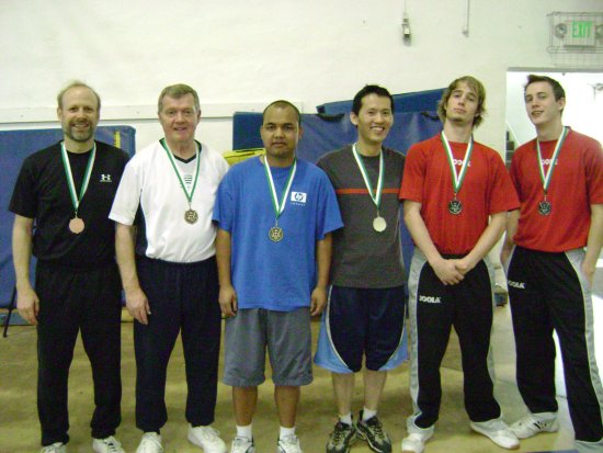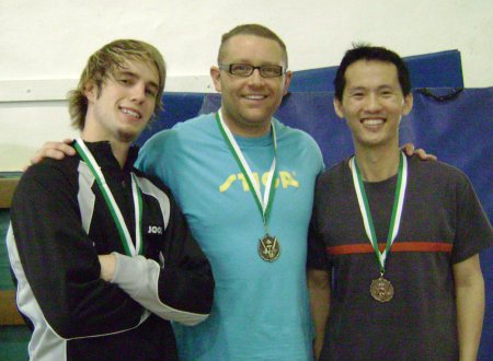 This was a hard fought event. There was a three way tie in matches for the medals, which was decided by the win-loss record in games. Kenton Hartle was a new player. He is a tennis player who wanted to see how he could do in table tennis. He made some astounding returns of killer slams, and was able to beat Austin, who won the gold, in five games. That was quite a feat because Austin went on to go five games with players rated over 1300.