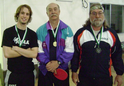 This was the first hardbat event in the history of this tournament. Hardbat means the old-fashioned pips out, no sponge rubber on an all wood bat, with games of 21 points. Each match was the best 2 of 3 games. The event was surprisingly close, with Carol Davis taking a game from tournament top-seed Ralph Stadelman, and only losing the bronze at deuce in the third game. And Matt, who placed last, took a game from Carol. So it was close indeed.