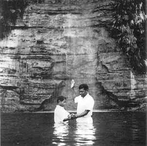 A boy is baptized a member of The Church of Jesus Christ of Latter-day Saints. Jesus said, "Ye shall go down and stand in the water, and in my name shall ye baptize them" (3 Ne. 11:23); "and he commandeth all men that they must repent, and be baptized in his name" (2 Ne. 9:23). A person who is baptized covenants with God to serve him and keep his commandments.
