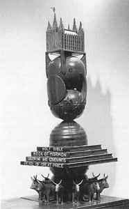 The Book of Life, by Alfred Raymond Wright (1949, carved pine, 40" high). Among the symbols included in this wood carving are twelve oxen, representing the Twelve Tribes of Israel, with a temple baptismal font resting on their backs; the four standard works of LDS scripture; a beehive, symbol of industry; spheres representing the telestial (stars), terrestrial (moon) and celestial (sun) kingdoms of glory; and a replica of the Salt Lake Temple, representing the attainment of the highest degree in the celestial kingdom. Church Museum of History and Art.